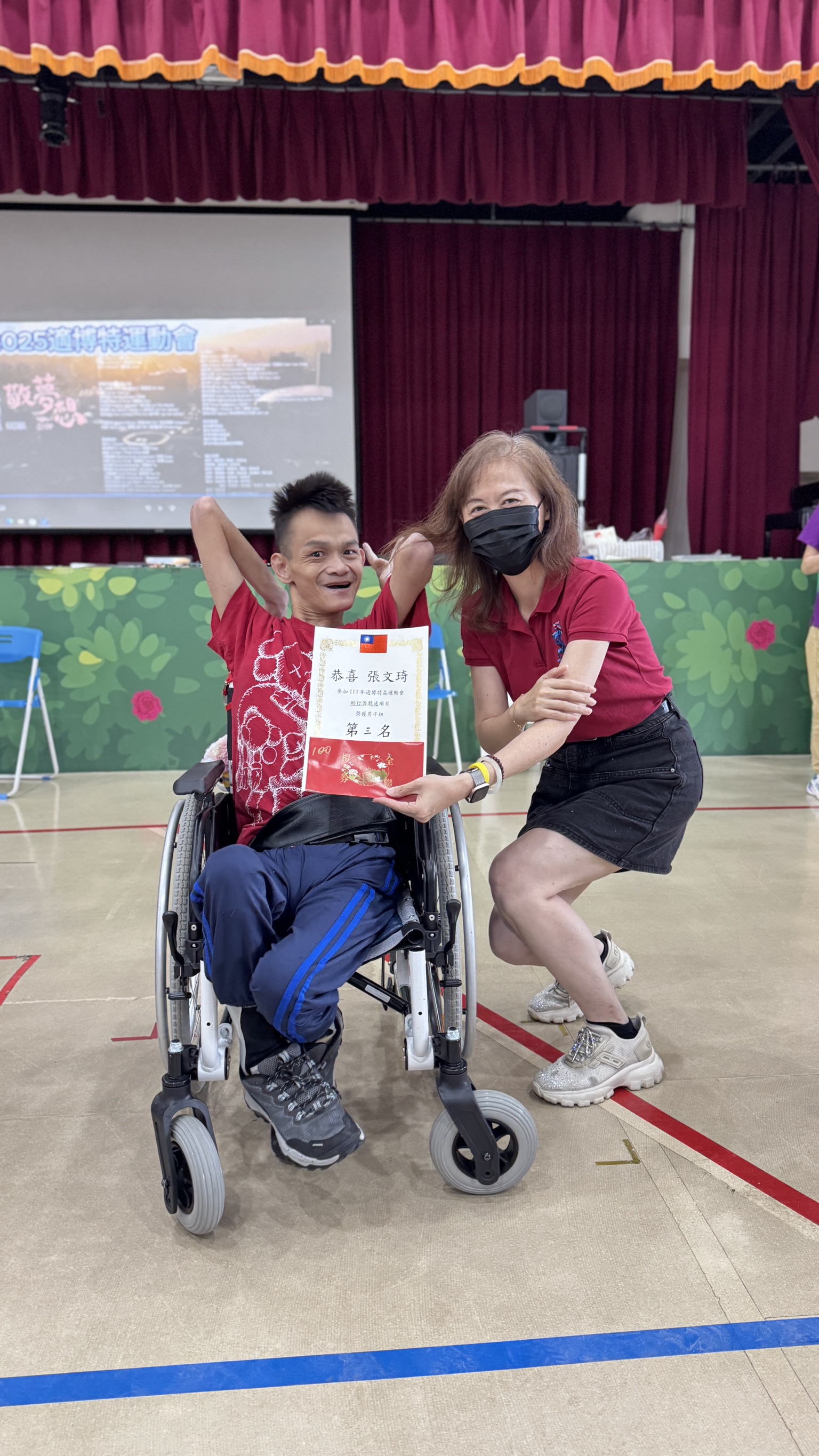 院生小文(左)在助行器競速榮獲第3名,八里愛心教養院院長..