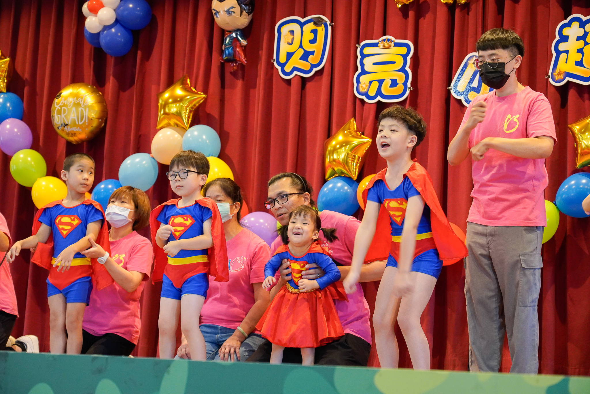 慢飛天使穿著小超人的披風表演,贏得全場熱烈掌聲
